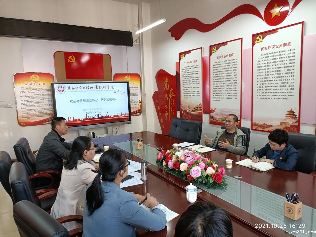 10月25日下午,学校纪委书记蒋雪刚、纪委办公室主任陶玉姣到建筑与道桥工程学院开展调研工作,建工学院肖万娟院长、刘冶敏副院长、党总支副书记姚紫燕、学生副科长黄耀业、软件采购协助实训管理员唐健灵和机房管理员刘生代表6人参加了调研会。