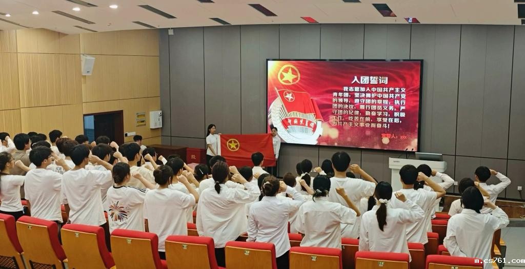 面对鲜艳的团旗,在梁银明老师的带领下,新团员们高举右拳,庄严宣誓:“我志愿加入中国共产主义青年团,坚决拥护中国共产党的领导……” 铿锵有力的誓言回荡在会场,展现出青年学子对共青团组织的无限忠诚和为共产主义事业奋斗的坚定决心。宣誓完毕后,新团员代表卢涛发言,他表示加入共青团是人生新的起点,今后将以团员的标准严格要求自己,努力学习,积极进取,用实际行动践行入团誓言,为团旗增光添彩。